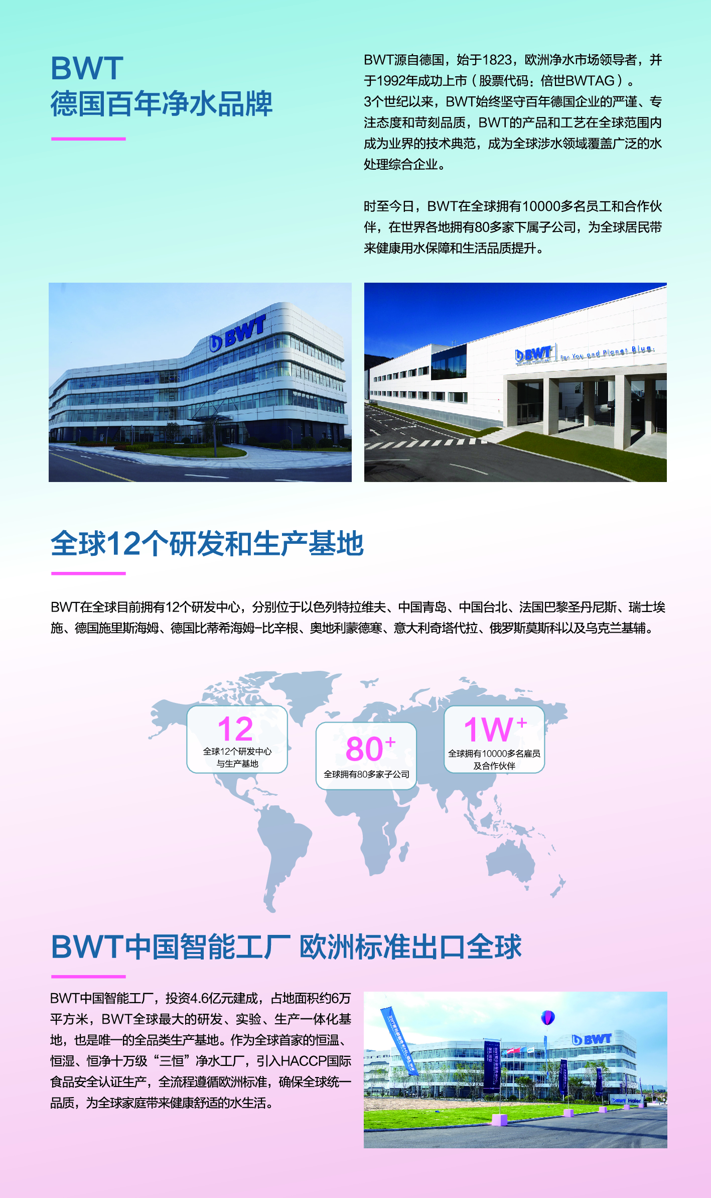 時(shí)至現(xiàn)在,BWVT在全球擁有10000多名員工和會(huì)作伙件,在世界各地?fù)碛?0多家下屬子公司,為全球居民帶來用水和生活品質(zhì)提升。